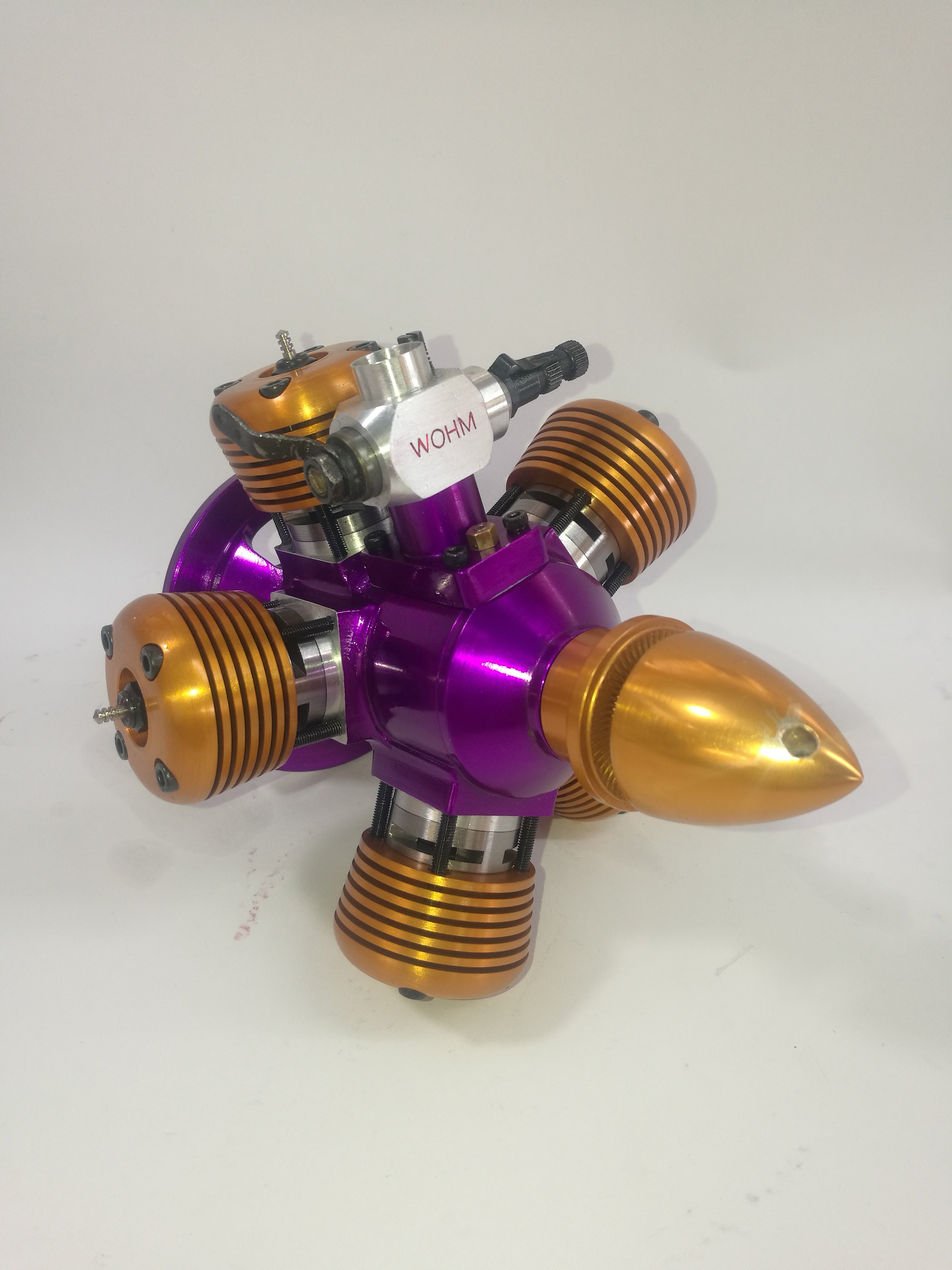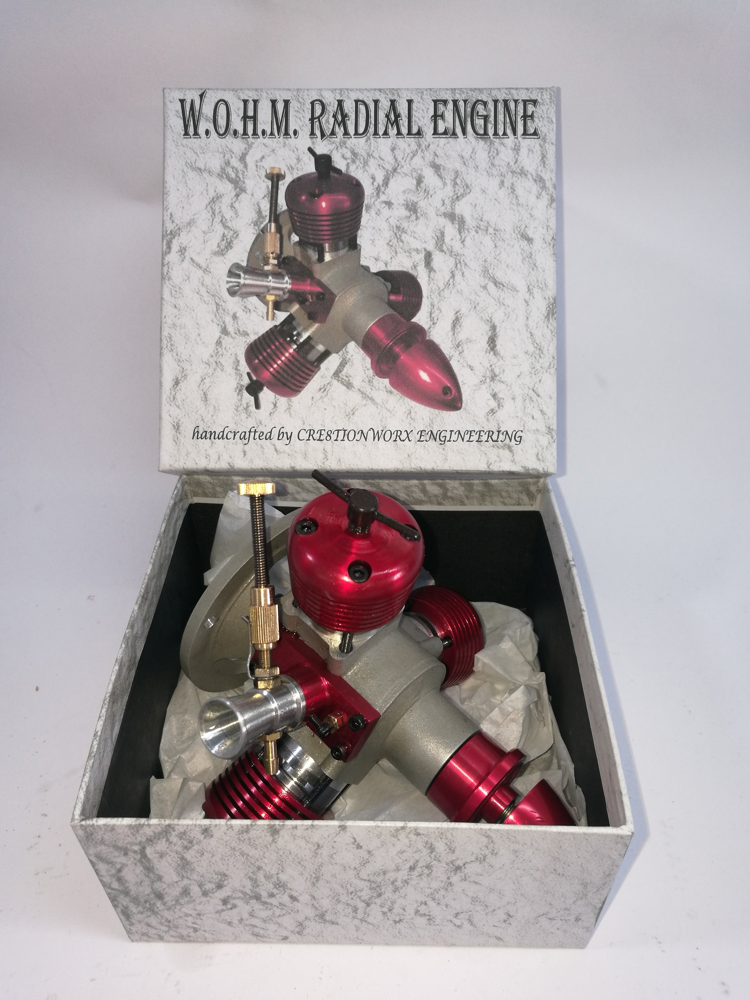 This is the prototype of the newly redesigned WOHM long stroke radial engine series due for release in early 2022. They are available in R/C and control line format with either reed valve or front rotary valve induction.