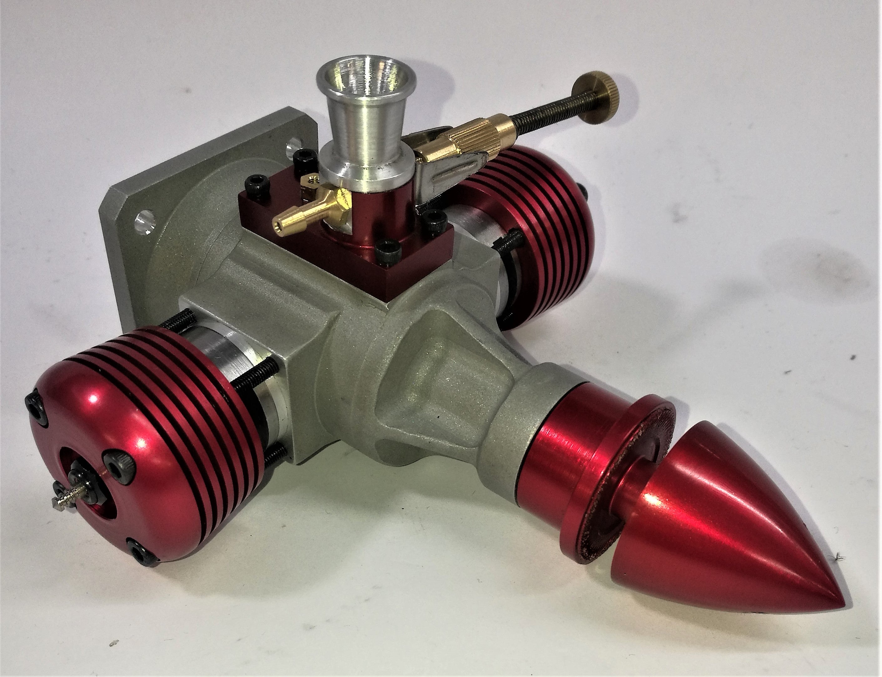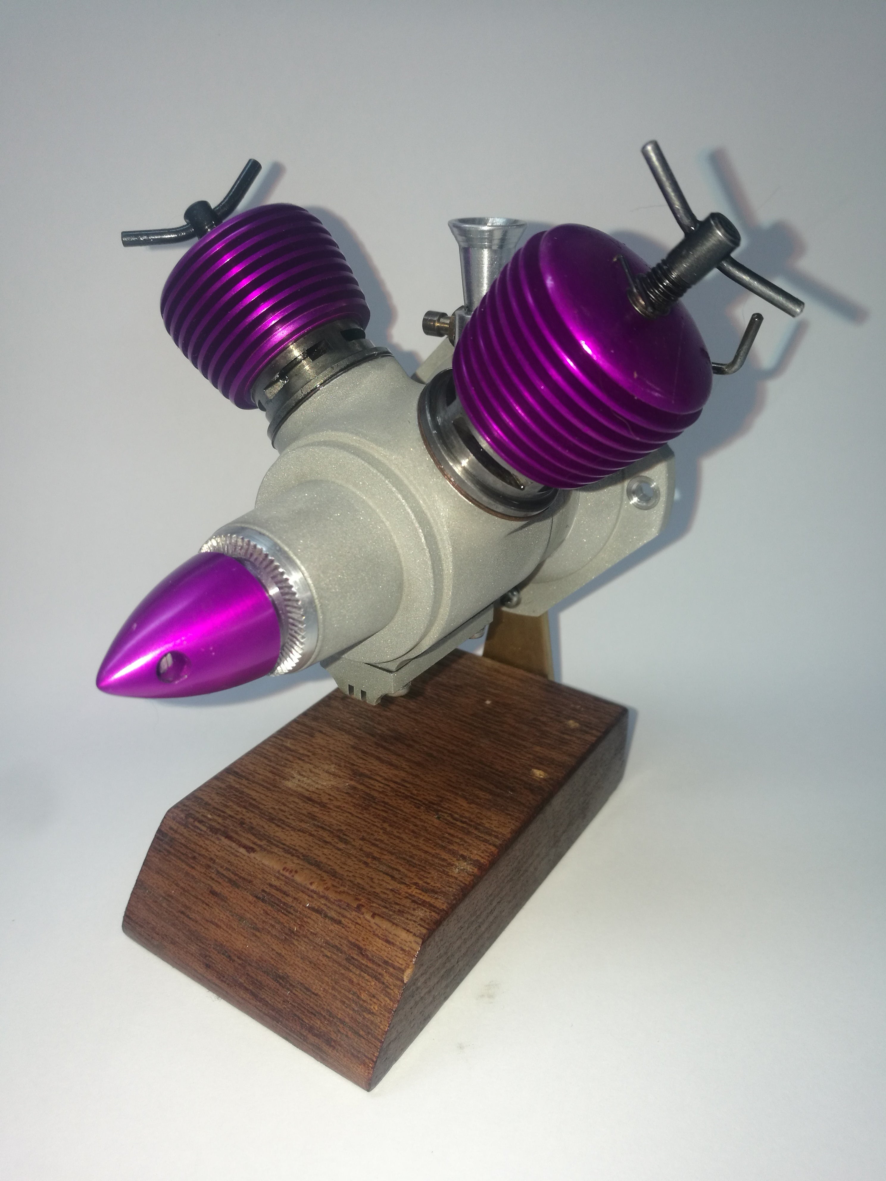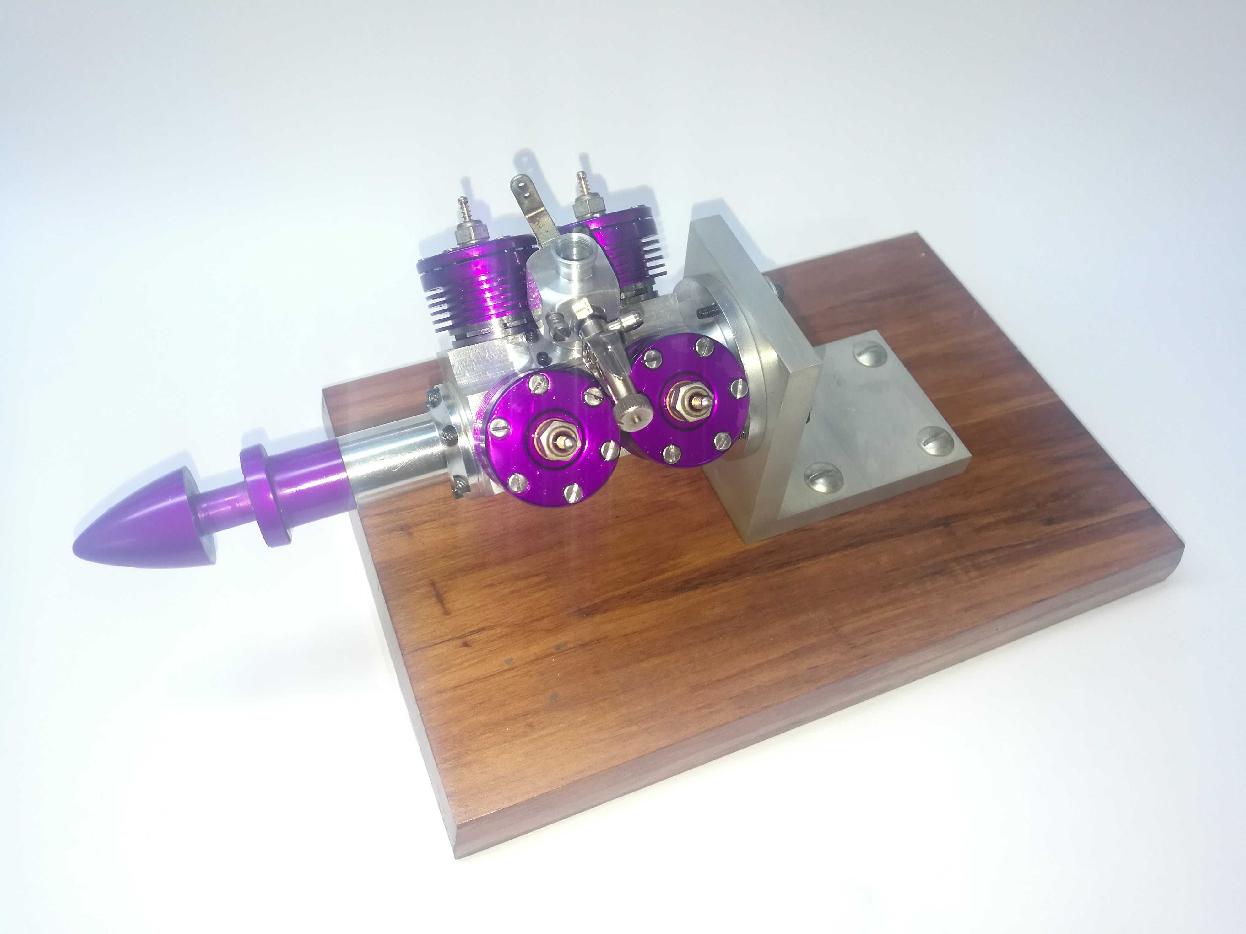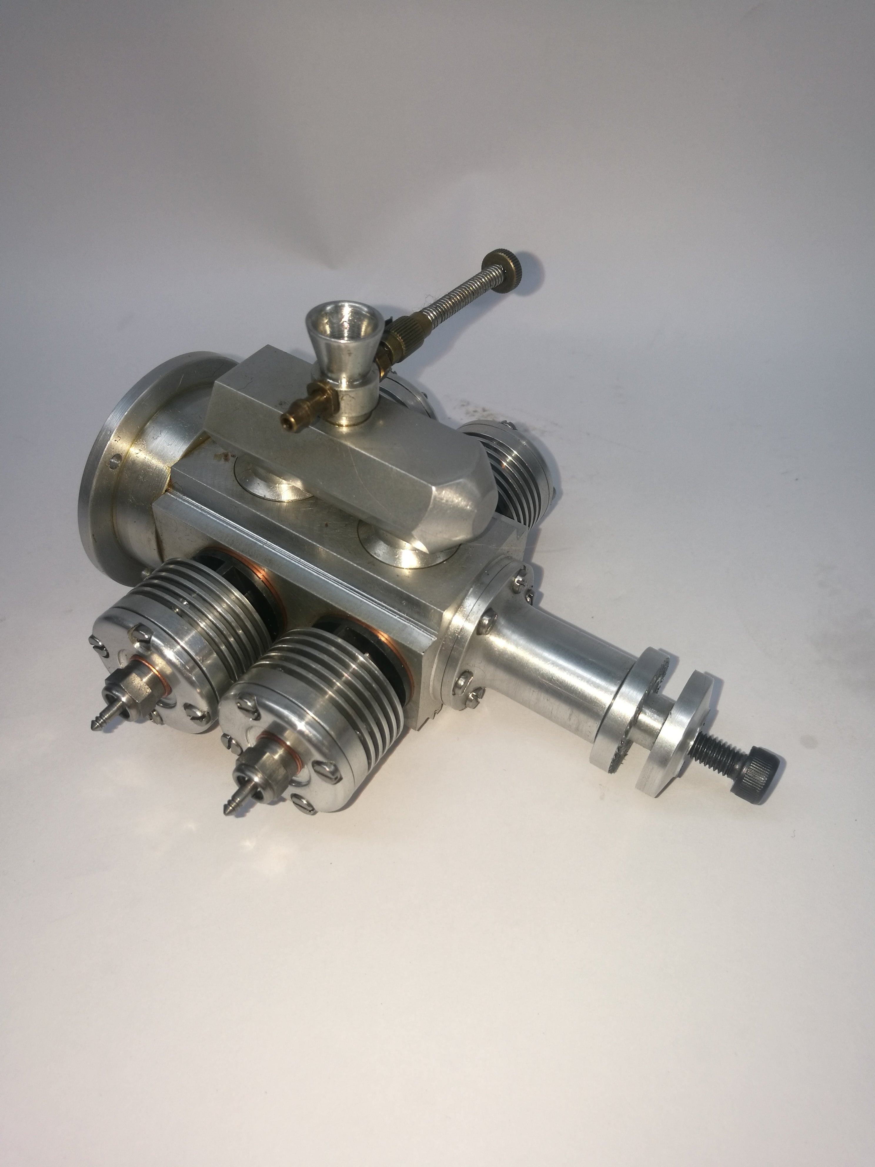 This engine was built as part of the development of the CLAMO Spectre V-twin engine. Built as a proof of concept and design layout check. The engine was built using 2 original Taifun Zyklon cylinder and liner assemblies fitted to factory made case/crankshaft assemblies, all machined from solid. Engine performs well. Total displacement is 5cc